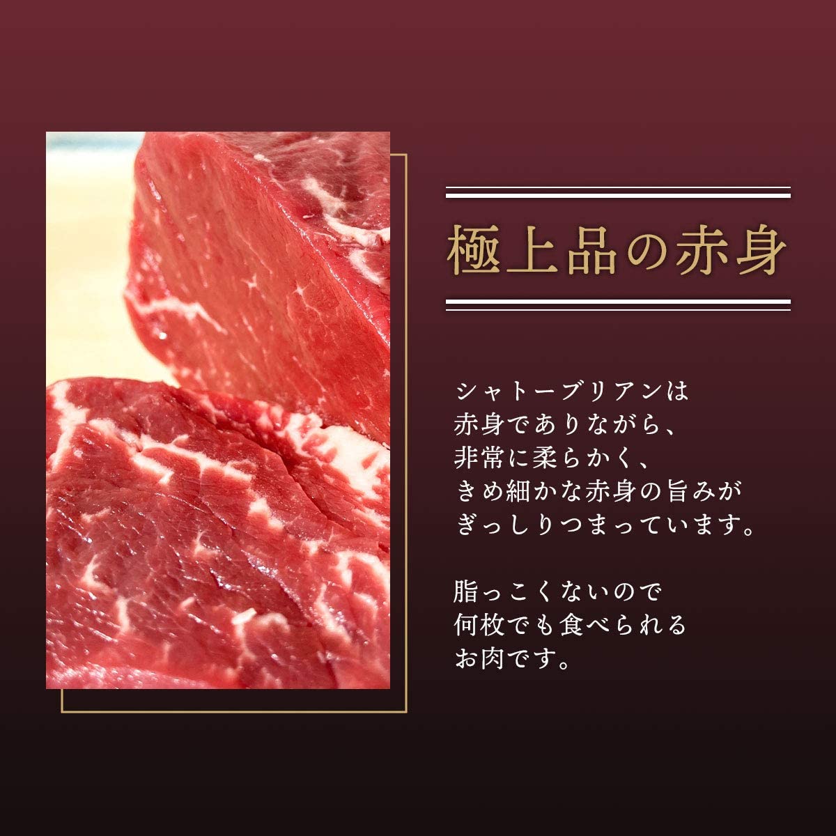 牛肉の女王様と呼ばれるシャトーブリアン。赤身なのに柔らかい肉質で、黒毛和牛と違ってペロリと食べられます。